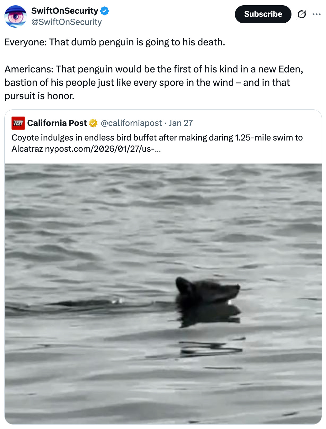You can watch the penguin part here, or read the transcript in this footnote.4 The other day, January 23 2026, the Trump White House tweeted this: